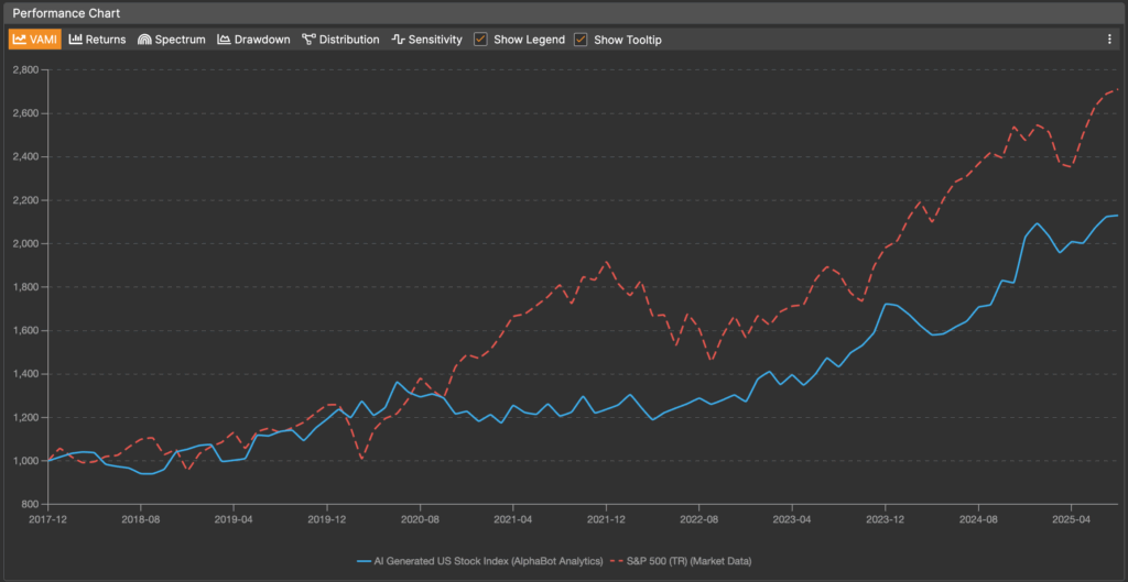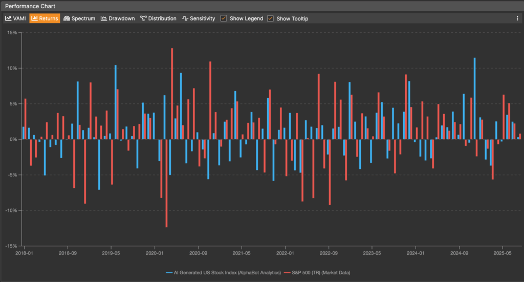 To illustrate how simplistic use of AI output can lead to wrong data, we have asked it to “Generate sample monthly returns for a broad US stock market index from 2010 to 2025”. The produced returns were uploaded to AlphaBot and compared with the S&P 500 index.